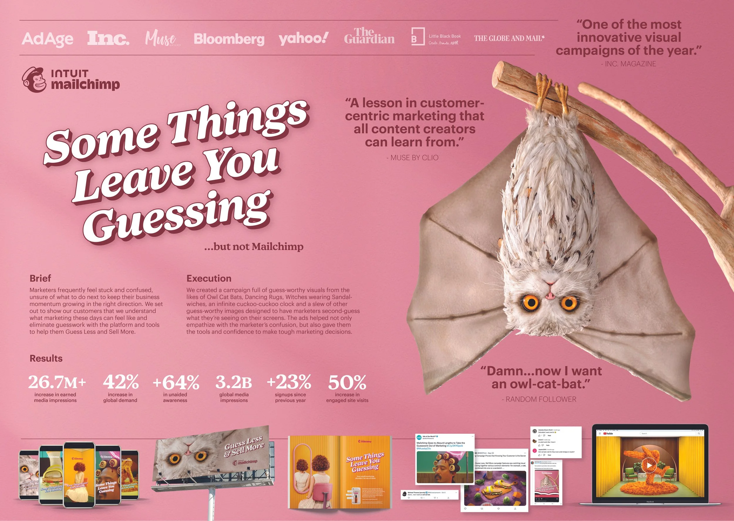 Marketers deal with hundreds of decisions each and every day and often feel paralyzed and confused on which decision will lead to more sales. So to empathize with our customers, we created the “Guess Less and Sell More” campaign. Showing marketers that some things may leave them guessing but not Mailchimp. Mailchimp’s data backed recommendations and AI tools eliminate the guesswork, leading to more informed decisions and increased sales.
